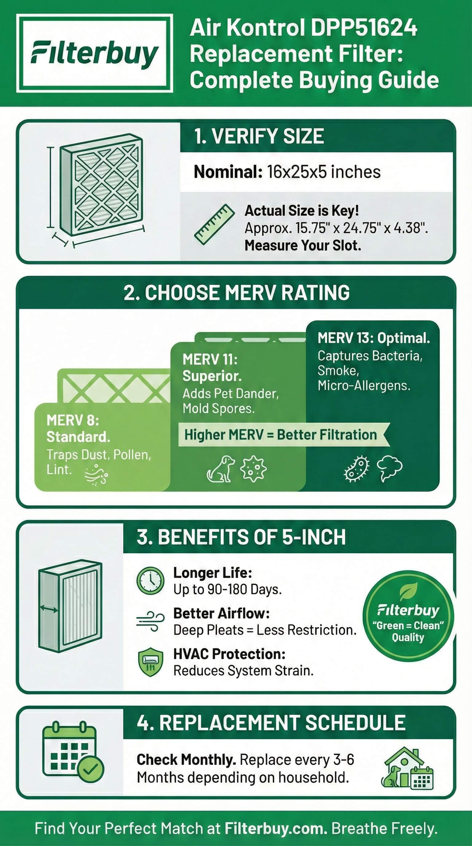 Air Kontrol air filters use standard HVAC sizing that allows for compatible replacements from quality manufacturers like Filterbuy. The DPP51624 corresponds to a 16x24x1 filter dimension. For optimal performance, choose a pleated filter rated MERV 8–13 based on your household needs: MERV 8 for basic dust control, MERV 11 for pet owners and allergy sufferers, or MERV 13 for maximum particle capture. Replace every 60–90 days for best results.